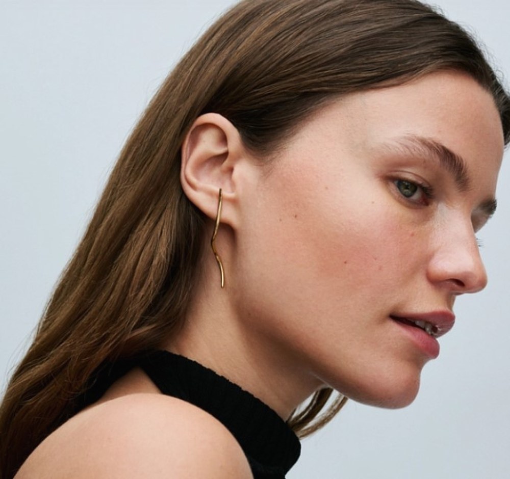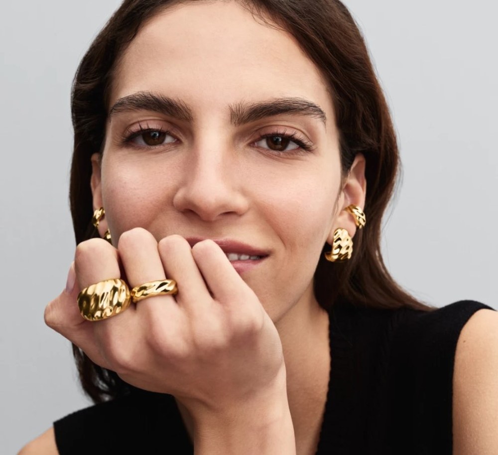 Не менее выразительным решением станет тройное геометрическое кольцо с позолотой и цирконами и серьги-гвоздики “Изящная волна”. Линии кольца, вдохновленные динамикой солнечной системы, находят продолжение в плавных изгибах серег. Вместе они формируют визуальное движение и придают образу легкость и изысканность.