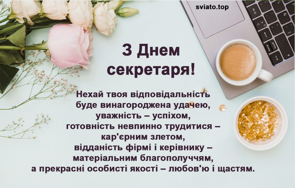Вітаю з Міжнародним днем секретаря і хочу побажати не втрачати в роботі жодної дрібниці, завжди знати відповідь на будь-яке питання, домагатися блискучих результатів і в діяльності, і в житті. Нехай твій кожен ранок починається з натхнення, нехай кожен день несе з собою удачу і світлу радість.