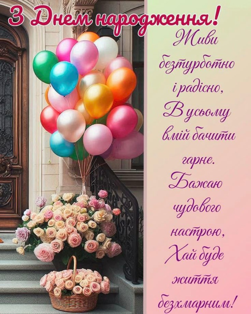 Вітаю з днем народження! Бажаю, щоб життя було сповнене гарних подій, щирих людей і легких днів.