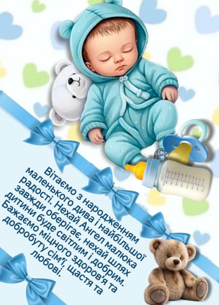 Малюче, сьогодні цілий світ бажає тобі щастя. Хай твої перші кроки ведуть до радості, а сміх наповнює дім. Бажаю, щоб у твоєму серці завжди жила любов.