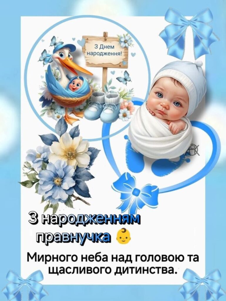 Мій правнуку, ти даруєш нашій родині радість і світло. Хай у твоєму серці живе цікавість до життя, бажання пізнавати світ і робити добро. Нехай кожен день буде сповнений сміху й теплих обіймів.