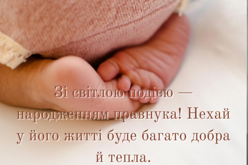 Маленький правнуку, хай кожен твій день буде схожим на казку. Бажаю, щоб тебе завжди оточували добрі люди й усмішки. Хай дитинство буде солодким, як твої перші кроки до мрій.