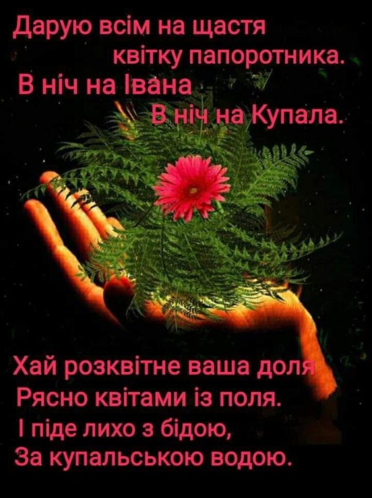 Бажаю тобі сьогодні знайти свою маленьку “квітку папороті”. Хай вона стане символом удачі та відкриє дорогу до нових можливостей. Нехай у твоєму житті завжди буде місце для дива.